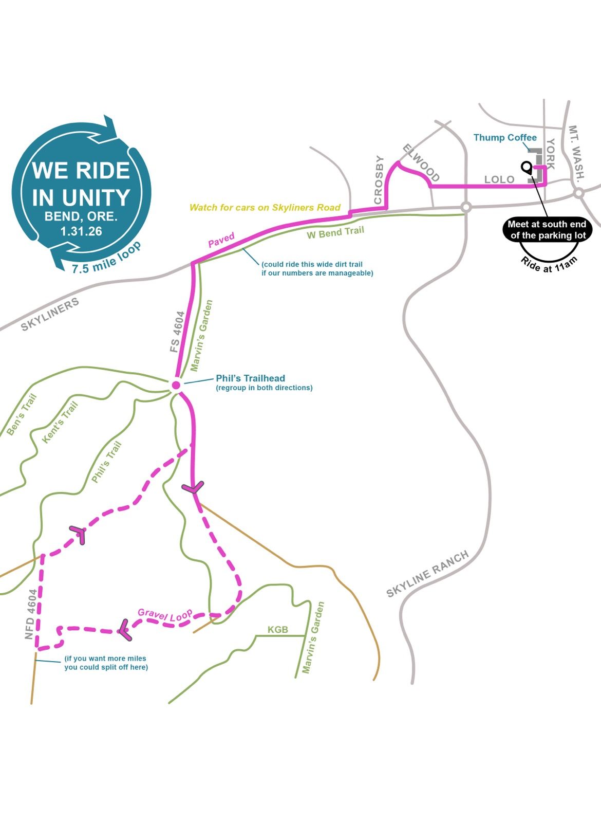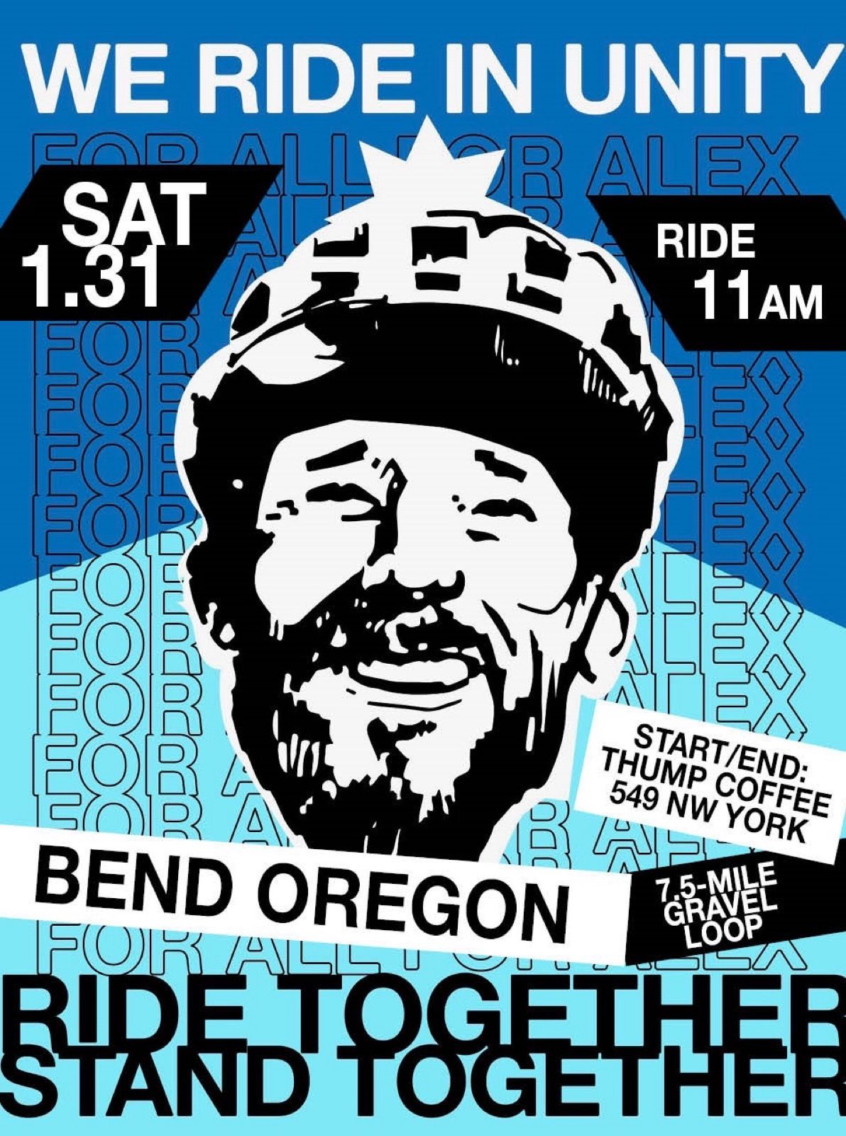 Saturday is a big day for national bike rides to honor the murdered Alex Pretti, who loved a gravel ride. Let's ride for Alex, for Renee Good, for stopping this fascist shit! It's one of our basic 13-mile loops. Not a hammer-fest. The point is to reconnect this mid-winter, talk and ride, and see how we can support each other and our communities amidst all this viciousness. Meet a bit before, and roll at 11am. Route updated as of 1.29.26 at roughly 3:00pm. Shorter 7.5 mile out and back. Half streets and half gravel. Still starting at Thump parking. See @misterbenweber on Instagram for the latest. Thanks!